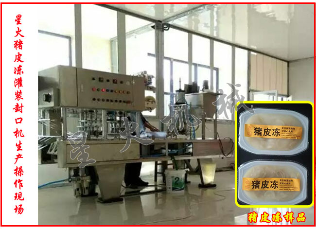 不管是冬季還是夏季,豬皮凍都是市場上非常熱銷的涼菜,人們都非常喜愛這種便捷的食用食品,也因此豬皮凍的市場很好。自打豬皮凍熱銷起來,帶動了相關(guān)產(chǎn)業(yè)的發(fā)展,豬皮凍的加工以及在市場上的銷售是離不開灌裝封口機的。今天星火封口機公司為大家介紹一款專門適合盒裝豬皮凍生產(chǎn)的豬皮凍灌裝封口機,豬皮凍灌裝封口機適用于各種豬皮凍、八寶粥、綠豆沙等產(chǎn)品的盒裝、碗裝、杯裝生產(chǎn),能自動完成塑料盒/碗/杯的自動落盒/碗/杯、充填米、充填蓮子等、水灌裝、紫外線消菌、光電定位、兩道熱封、自動對芯剪切及廢膜回收等功能。