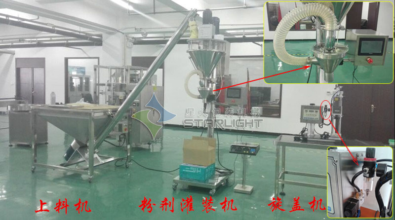 消防粉灌裝生產(chǎn)線/全自動粉末灌裝生產(chǎn)線前部分工序設(shè)備:上料-粉劑灌裝-旋蓋